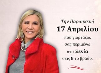 Οπως σημειώνει στην πρόσκληση της, την Παρασκευή, 17 Απριλίου που γιορτάζω, σας περιμένω, στο Ξενία, στις 8 το βράδυ.Και σας περιμένω με χαρά!
