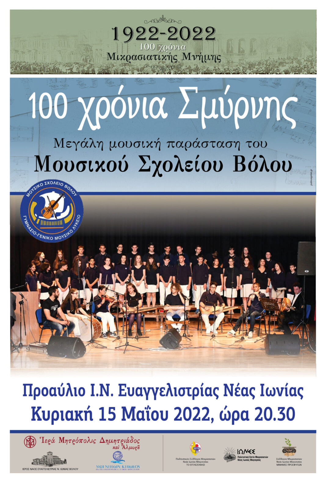 Το Μουσικό Σχολείο τιμά την επέτειο των 100 χρόνων μνήμης από την Μικρασιατική καταστροφή, από την ανθρώπινη αυτή τραγωδία με ανείπωτο τίμημα με όρους ανθρώπινου πόνου με την μουσική παράσταση «100 χρόνια Σμύρνης».
