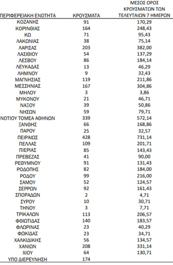 Τριψήφιος ήταν ο αριθμός των κρουσμάτων στις εξής περιφέρειες (αλφαβητικά)
