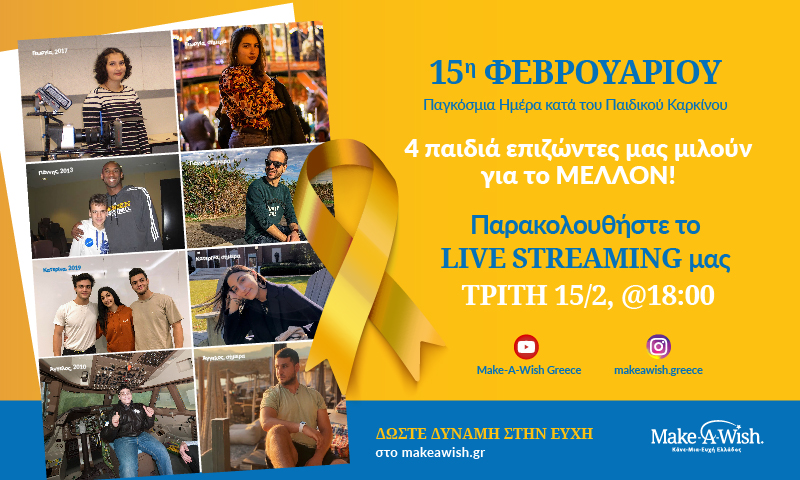 Στις 15 Φεβρουαρίου, γιορτάζουμε το θάρρος, τον αγώνα και το μέλλον των παιδιών που παλεύουν και σας προσκαλούμε να παρακολουθήσετε την εξέλιξη της υγείας και της ζωής τεσσάρων παιδιών μας, ενώ εκείνα παράλληλα θα μας μεταφέρουν το αισιόδοξο μήνυμα της επιβίωσης από τον καρκίνο. Η Γεωργία, η Κατερίνα, ο Άγγελος και ο Γιάννης, έχουν ενηλικιωθεί, έχουν ακολουθήσει ιατρικά επαγγέλματα και έχουν παραμείνει εθελοντές μας. Ο καθένας τους έχει μία μοναδική ιστορία να μοιραστεί σχετικά με την επίδραση της ευχής στη ζωή του, και αυτό θα συμβεί μέσα από ένα μοναδικό live streaming στο Instagram του Make-A-Wish Ελλάδος στις 15 Φεβρουαρίου, στις 18:00. Τη συζήτηση θα συντονίσει ο επιστημονικός σύμβουλος του οργανισμού, και Διευθυντής του Τμήματος Παιδιατρικής Αιματολογίας – Ογκολογίας του ΕΛΠΙΔΑ, Dr Βασίλειος Παπαδάκης. Από το live streaming δεν θα λείψουν και οι εθελοντικές εμπειρίες ανθρώπων που έχουν βιώσει την θεραπευτική δύναμη της εκπλήρωσης μίας ευχής.