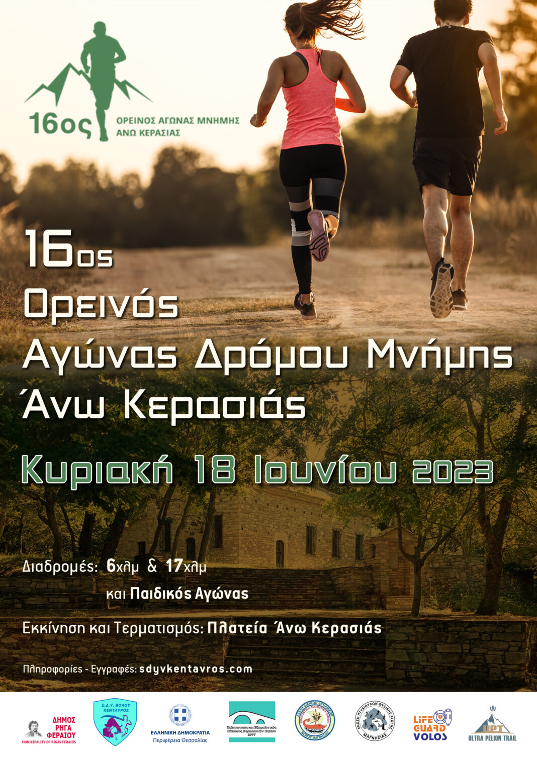 Ο Κένταυρος Βόλου, o Δήμος Ρήγα Φεραίου, η Περιφέρεια Θεσσαλίας, ο Πολιτιστικός Σύλλογος Κερασιάς, η ΕΠΦΑ Μαγνησίας και το UltraPelionTrail, διοργανώνουν τον «16ο Ορεινό Αγώνα Μνήμης Άνω Κερασιάς» στις 18 Ιουνίου 2023. Πολύτιμες υπηρεσίες θα προσφέρει η Λέσχη Ειδικών Δυνάμεων Ν. Μαγνησίας και η LIFEGUARDVOLOS.Τον αγώνα στηρίζουν επίσης ο Γ.Σ. Βόλου, ο Άτλας Βόλου, ο Α.Ο. Μαγνησίας, η Νίκη Βόλου, ο ΕΟΣ Βόλου και ο ΕΟΣ Αλμυρού.