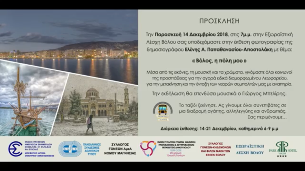 Είκοσι χιλιάδες ευρώ έχουν καταφέρει να συγκεντρώσουν οι γονείς των παιδιών με αναπηρία του ΕΕΕΕΚ Βόλου για την αγορά του πολυπόθητου λεωφορείο για τη μεταφορά των παιδιών τους. Το κύμα αλληλεγγύης και στήριξης της προσπάθειας συνεχίζεται με πολλές δράσεις μέσα στην εορταστική περιόδο ελπίζοντας όπως έλεγε η Πρόεδρος του Συλλόγου Ράνια Καρανικόλα ο Άγιος Βασίλης να είναι απλόχερος μαζί τους. Μία από τις δράσεις που ξεχωρίζουν -τα έσοδα της οποιας θα διατεθούν για την αγορά του λεοφωρείου – είναι και αυτή στις 14 Δεκεμβρίου στις 7μ.μ. στην Εξωραϊστική Λέσχη Βόλου, της έκθεσης φωτογραφίας της δημοσιογράφου Ελένης Παπαθανασίου με θέμα «Βόλος η πόλη μου».