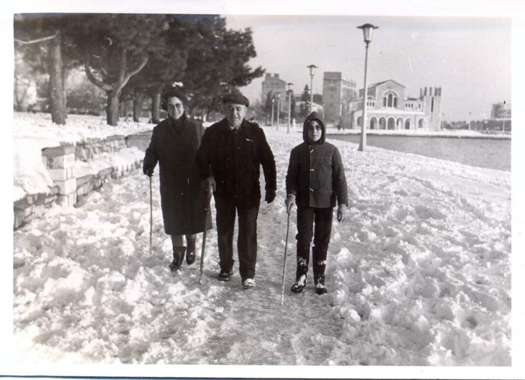 Αυτή η φωτογραφία τραβήχτηκε την Κυριακή 9 Ιανουαρίου 1966, στην “στενή” παραλία, με χιόνι. Εικονίζονται ο Πατέρας, η Μητέρα και η αφεντιά μου. Αλλά αυτό λίγο ενδιαφέρει την Ιστορία της Μαγννησίας… Το, κατ’ εμέ, ενδιαφέρον βρίσκεται στο φόντο, όπου φαίνεται ο μύλος του Ζαρζάμπα (Καπουρνιώτη-Παντή), η ψηλή αποθήκη στην οδό Τσοποτού, στην οποία έφτανε το τραίνο (υπάρχουν ακόμη οι σιδηροδρομικές γραμμές), το ξενοδοχείο «Ξενία» δεξιά, και ο ιερός ναός των Αγίων Κωνσταντίνου και Ελένης με το … λιγότερο από μισό καμπαναριό.
