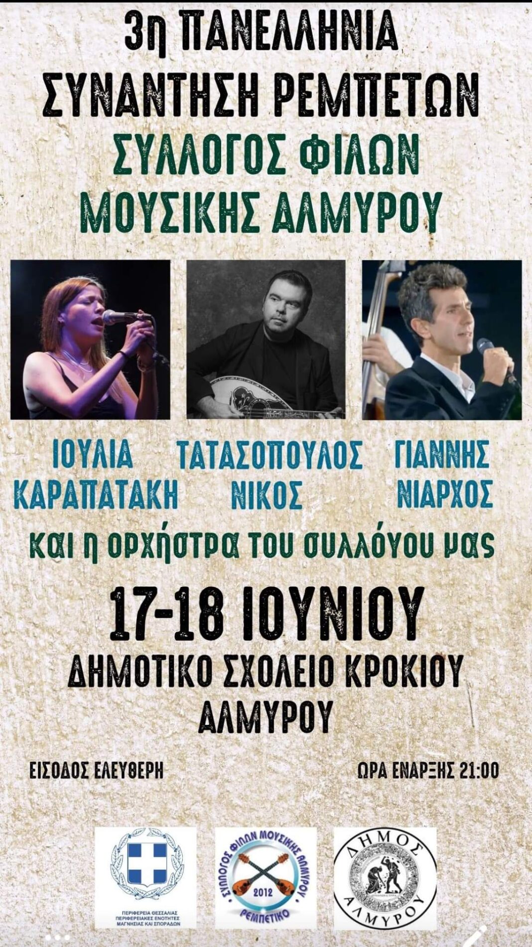 Ο σύλλογος Φίλων μουσικής Αλμυρού “ρεμπέτικο”, διοργανώνει τη 3η πανελλήνια συνάντηση ρεμπετών στις 17 και 18 Ιουνίου στον Κρόκιο Αλμυρού.