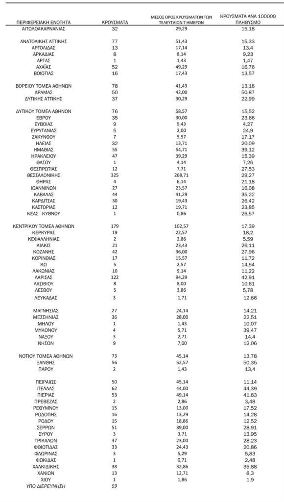 Τα νέα εργαστηριακά επιβεβαιωμένα κρούσματα της νόσου που καταγράφηκαν τις τελευταίες 24 ώρες είναι 2.187, εκ των οποίων 4 εντοπίστηκαν κατόπιν ελέγχων στις πύλες εισόδου της χώρας. Ο συνολικός αριθμός των κρουσμάτων ανέρχεται σε 653.535 (ημερήσια μεταβολή +0.3%), εκ των οποίων 50.9% άνδρες. Με βάση τα επιβεβαιωμένα κρούσματα των τελευταίων 7 ημερών, 77 θεωρούνται σχετιζόμενα με ταξίδι από το εξωτερικό και 3.183 είναι σχετιζόμενα με ήδη γνωστό κρούσμα.To 𝑅𝑡 για την επικράτεια βάσει των κρουσμάτων εκτιμάται σε 0.95 (95% ΔΕ: 0.89 – 1.00). Οι νέοι θάνατοι ασθενών με COVID-19 είναι 44, ενώ από την έναρξη της επιδημίας έχουν καταγραφεί συνολικά 14.795 θάνατοι. Το 95.4% είχε υποκείμενο νόσημα ή/και ηλικία 70 ετών και άνω. Ο αριθμός των ασθενών που νοσηλεύονται διασωληνωμένοι είναι 323 (62.8% άνδρες).