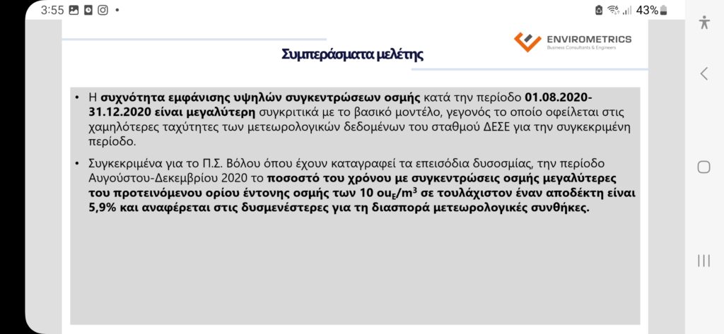 Η Περιφέρεια Θεσσαλίας, γνωστοποίησε τα αποτελέσματα της μελετης ΟΛΦΑΚΤΟΜΕΤΡΙΑΣ από την οποία προκύπτει πως έξι βιομηχανίες της περιοχής, συνέβαλαν, στα επεισόδια δυσοσμίας που υπήρξαν στην πόλη του Βολου από τον Αύγουστο μέχρι τον Δεκέμβριο του 2020. Οι οσμές όπως τονίστηκε απο την καθηγήτρια κα Σαμαρά που παρουσίασε την μελέτη, δεν συγκαταλέγονται σε τοξικές ή καρκινογόνες ενώσεις. Υπάρχουν ωστόσο επιδράσεις στο αναπνευστικό, ερεθισμός στα μάτια, μύτη και λαιμό. Επίσης προκαλείται έμετος και αϋπνίες σε υψηλές συγκεντρώσεις αλλά δεν είναι τοξικές οπως ειπώθηκε καθώς και δεν παραμένουν πολύ στην ατμόσφαιρα λόγω δραστικότητας.