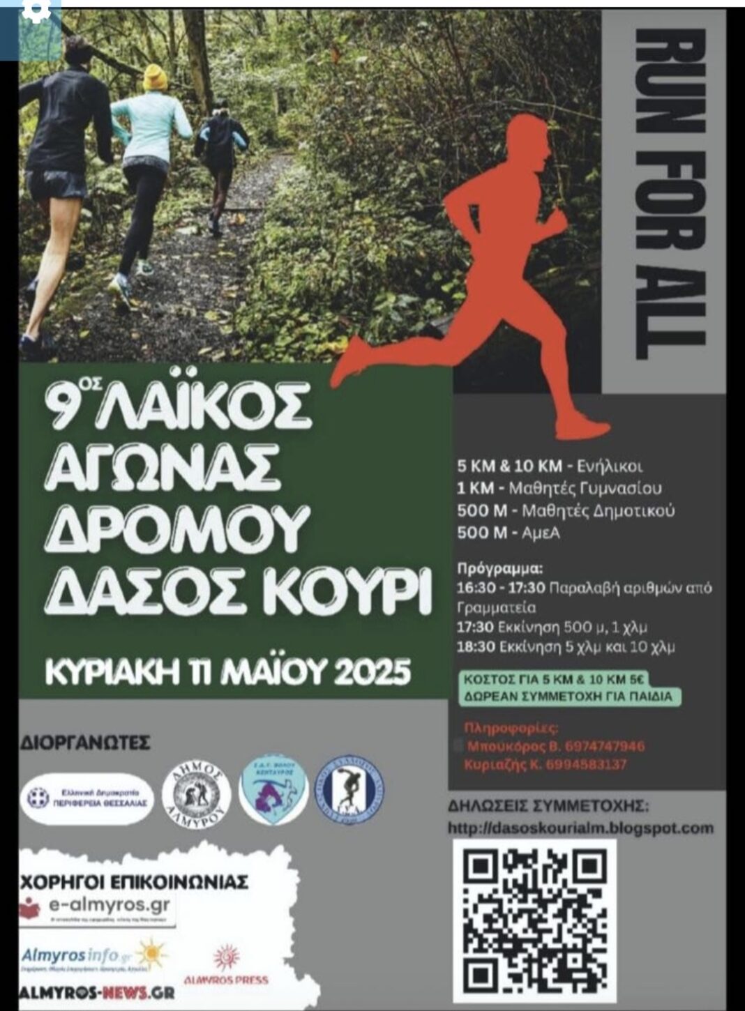 Ο Σύλλογος Φίλων Δάσους Κουρί, σε συνεργασία με την Περιφέρεια Θεσσαλίας, τον Δήμο Αλμυρού, τον Σύλλογο Δρομέων Υγείας Βόλου “Κένταυρος” και τον Γ.Σ. Αλμυρού, διοργανώνει και φέτος τον 9ο Λαϊκό Αγώνα Δρόμου στο Δάσος Κουρί, το Σάββατο 11 Μαϊου 2025 και με ώρα έναρξης 17.30