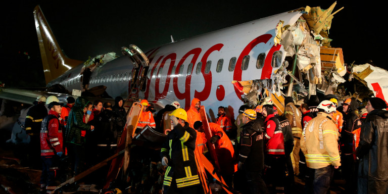 Το δυστύχημα, που καταγράφηκε από κάμερα ασφαλείας στο αεροδρόμιο, έφερε τρία θύματα, ενώ άλλοι 179 άνθρωποι της πτήσης της εταιρίας Pegasus, έχουν τραυματιστεί. Το αεροσκάφος ταξίδευε από την Σμύρνη για την Κωνσταντινούπολη, όπου κατά την προσγείωση κόπηκε στα τρία και άρπαξε φωτιά. Οι αρχές κάνουν λόγο για κακές καιρικές συνθήκες που προκάλεσαν το δυστύχημα.