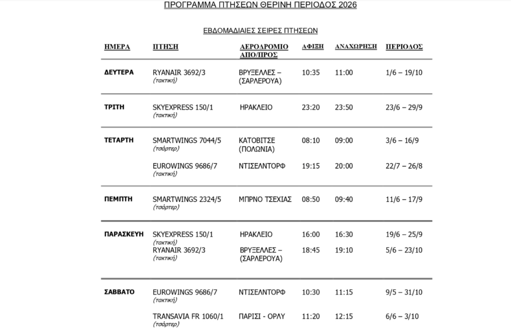 Δόθηκε στην δημοσιότητα σήμερα το πρόγραμμα πτήσεων από και προς το αεροδρόμιο της Νέας Αγχιάλου για το καλοκαίρι του 2026. Ανάμεσα στις πτήσεις που αυξάνονται σε σχέση με πέρυσι κατά δύο, ξεχωρίζουν οι δύο πτήσεις ανά εβδομάδα της Ryanair, η σύνδεση από φέτος με την Πολωνία και η πτήση της Eurowings από το Ντίσελντορφ.