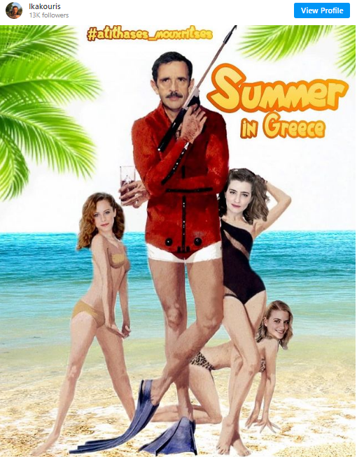 Το βράδυ της Πέμπτης, θέλησε να αναρτήσει στον προσωπικό του λογαριασμό μια εικόνα από τις «Άγριες Μέλισσες» αλλά σε… καλοκαιρινή εκδοχή. Αντί για όπλο κρατά ψαροντούφεκο, ενώ πίσω τους στην παραλία βρίσκονται πάντα οι αδελφές Σταμίρη.