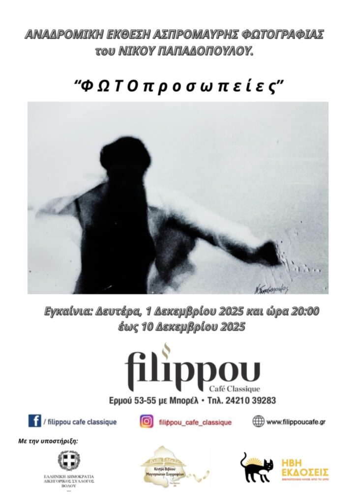 Το Filippou cafe classique έχει τη χαρά να φιλοξενήσει στον χώρο του (Ερμού 55, στον Βόλο) από την 1 έως τις 10 Δεκεμβρίου 2025 την ατομική αναδρομική έκθεση ασπρόμαυρης φωτογραφίας του δικηγόρου, συγγραφέα κι ερασιτέχνη φωτογράφου Νίκου Παπαδόπουλου. Οι λάτρεις της φωτογραφίας θα έχουν την ευκαιρία να θαυμάσουν έργα αναλογικής λήψης που εμφανίστηκαν κι εκτυπώθηκαν σε σκοτεινό θάλαμο με την παλιά κλασική μέθοδο. Θα έχουν επίσης τη δυνατότητα να πληροφορηθούν τη διαδικασία που ακολουθούταν κάποτε για την εμφάνιση των φιλμς και την εκτύπωση των αρνητικών. Πέραν τούτου όμως, ο επισκέπτης θα έχει την ευκαιρία να «συνομιλήσει» με τα φωτογραφικά πορτρέτα που εκτίθενται κι ιχνηλατώντας το βλέμμα, την κλίση του προσώπου, τη στάση του σώματος σε συνδυασμό με την οπτική γωνία λήψης ν’ αφουγκραστεί σκέψεις και συναισθήματα που αναδίδονται μέσα απ’ το εγκλωβισμένο για τουλάχιστον 30 χρόνια αποτύπωμα φωτός της κάθε φωτοπροσωπείας και – γιατί όχι – ν’ αναψηλαφήσει τους δικούς του λογισμούς, όπως αυτοί εξέλαμψαν το δικό τους φως σ’ ένα κλικ ολίγων εκατοστών του δευτερολέπτου πάνω στην φωτοευαίσθητη επιφάνεια του νου.