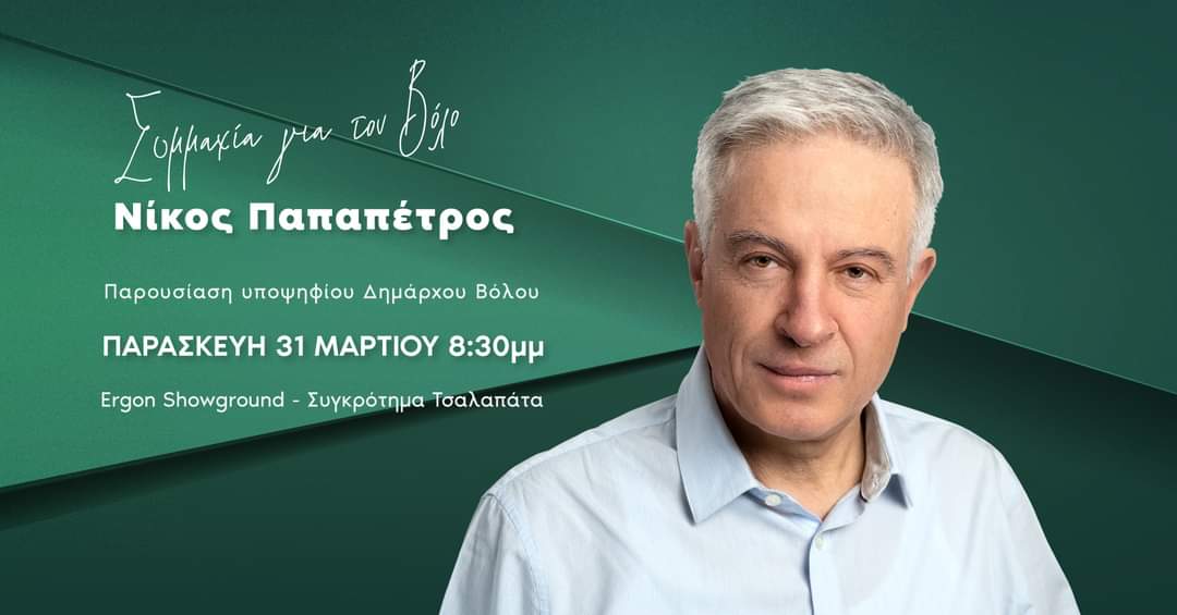 Ο δικηγόρος Νίκος Παπαπέτρος, την Παρασκευή 31 Μαρτίου 2023 στις 20:30 στο Ergon Showground, στον Πολυχώρο Τσαλαπάτα στα Παλαιά Βόλου, θα ανακοινώσει το βασικό προγραμματικό πλαίσιο και τις στοχεύσεις της υποψηφιότητας του καθώς και τη συγκρότηση της νέας δημοτικής παράταξης «Συμμαχία για τον Βόλο».