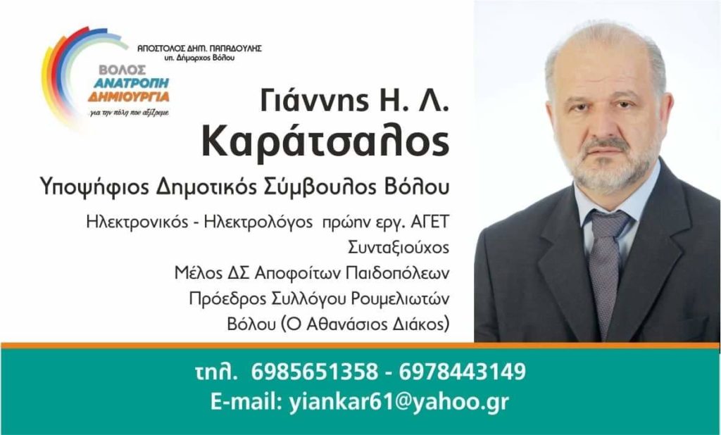 Του Γιάννη Καράτσαλου υποψήφιου Δημοτικού Συμβούλου με τον συνδυασμό “Βολος, Ανατροπή Δημιουργία”