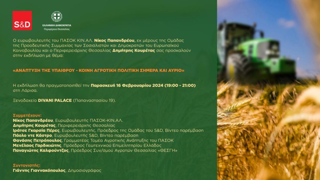 Εκδήλωση για την ανάπτυξη της Υπαίθρου και την ΚΑΠ πραγματοποιεί η Ομάδα της Προοδευτικής Συμμαχίας των Σοσιαλιστών και Δημοκρατών του Ευρωπαϊκού Κοινοβουλίου με πρωτοβουλία του ευρωβουλευτή και επικεφαλής της Κοινοβουλευτικής Ομάδας του ΠΑΣΟΚ στο Ευρωπαϊκό Κοινοβούλιο Νίκου Παπανδρέου, σε συνδιοργάνωση με την Περιφέρεια Θεσσαλίας και τον Περιφερειάρχη Δημήτρη Κουρέτα την Παρασκευή 16 Φεβρουαρίου 2024, 19:00-21:00, στη Λάρισα στο Ξενοδοχείο Divani Palace.
