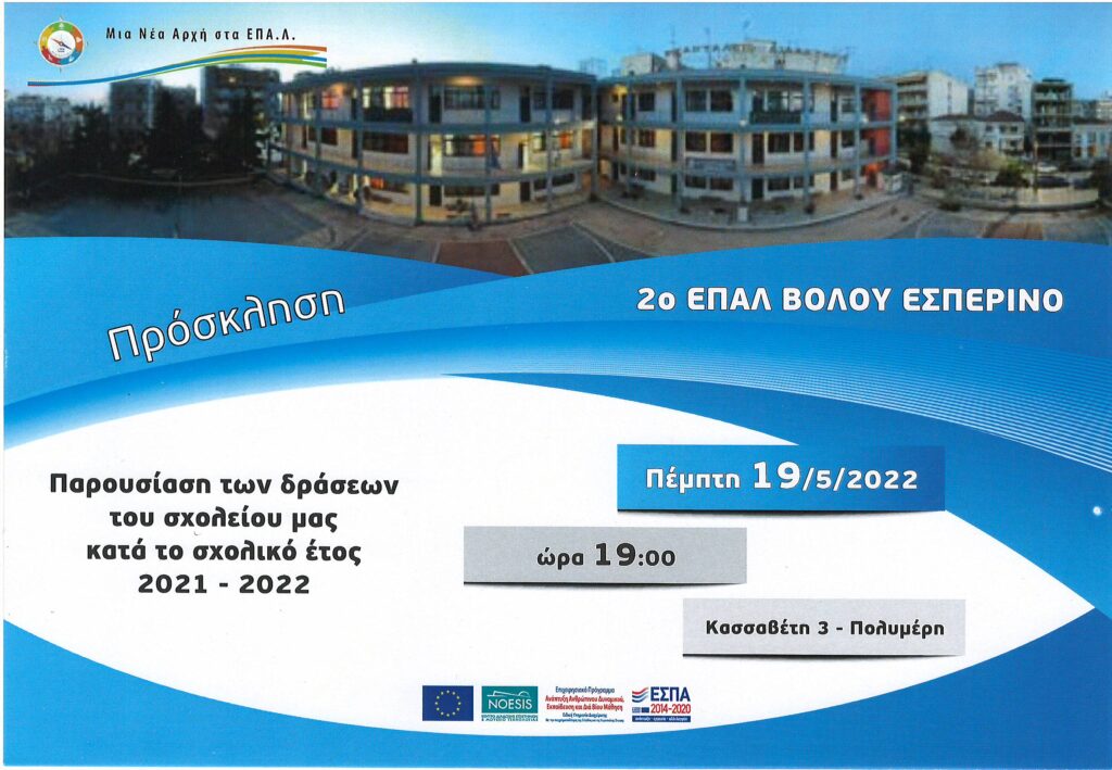 Καλούμε τους μαθητές και τις μαθήτριες, τους γονείς/κηδεμόνες, συγγενείς και φίλους τους, τους συναδέλφους εκπαιδευτικούς, τους συμπολίτες μας που επιθυμούν, να παρευρεθείτε στην εκδήλωση που διοργανώνει το σχολείο μας, 2ο ΕΠΑΛ Βόλου Εσπερινό, αύριο, Πέμπτη 19 Μαΐου 2022 και ώρα 19:00, για την παρουσίαση των δράσεων που υλοποίησαν οι μαθητές/-τριές μας με τους εκπαιδευτικούς τους, τη σχολική χρονιά 2021-2022.