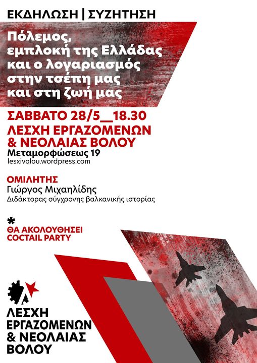 Σε αυτή την κατεύθυνση και με τη φιλοδοξία να συμβάλλουμε στη συγκρότηση ενός κινήματος με αυτό το χαρακτήρα, η Λέσχη εργαζομένων και νεολαίας διοργανώνει το Σάββατο 28/05 στις 18:30 στο χώρο της (Μεταμορφώσεως 19) εκδήλωση με θέμα “Πόλεμος, εμπλοκή της Ελλάδας και ο λογαριασμός στην τσέπη μας και στη ζωή μας.” Ομιλητή θα είναι ο Γιώργος Μιχαηλίδης, διδάκτορας σύγχρονης βαλκανικής ιστορίας. Μετά την εκδήλωση θα ακολουθήσει coctail party.