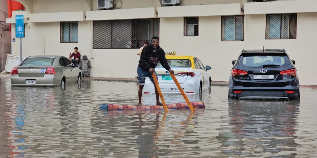 Vehicles navigate floodwater in Dubai’s Al Barsha 1 following heavy rain.