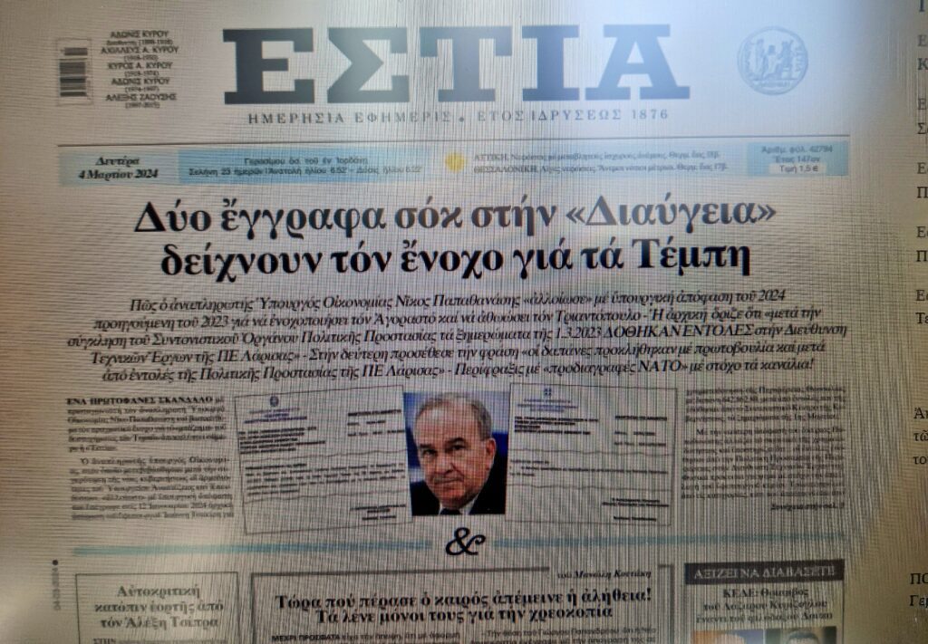 Σύμφωνα με την εφημερίδα “ο αναπληρωτής υπουργός Οικονομικών Νίκος Παπαθανάσης “αλλοίωσε” “με υπουργική απόφαση του 2024 προηγούμενη του 2023 για να ενοχοποιήσει τον Αγοραστό και να αθωώσει τον Τριαντόπουλο. Η αρχική ορίζε ότι “μετά την σύγκληση του Συντονιστικό Οργάνου Πολιτικής Προστασίας τα ξημερώματα της 13-3-2023 ΔΟΘΗΚΑΝ ΕΝΤΟΛΕΣστην Διεύθυνση Τεχνικών Έργων Π.Ε Λάρισας”- Στην δεύτερη προσέθεσε την φράση ” οι δαπάνες προκλήθηκαν με πρωτοβουλία κι μετά από εντολές της Πολιτικής Προστασίας της Π Ε Λάρισας” – Περίφραξις με “προδιαγραφές ΝΑΤΟ” με στόχο τα κανάλια!”