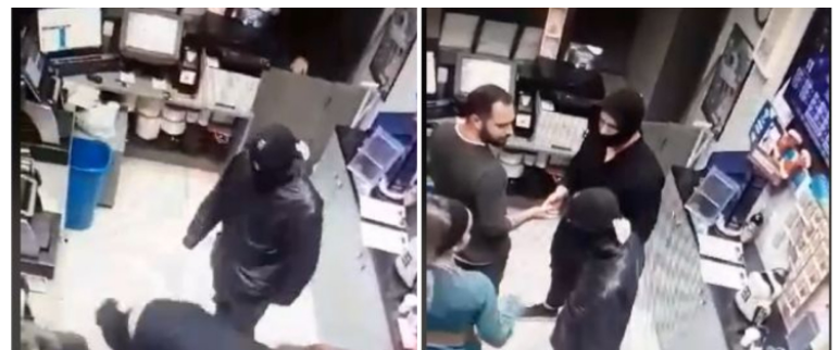 Ο υπάλληλος με την υπεύθυνη του μαγαζιού ανυποψίαστοι για το τι θα ακολουθήσει κάνουν τους τελευταίους υπολογισμούς, οπότε ξαφνικά μπουκάρουν μέσα δύο άτομα με κουκούλες. Ο ένας φορούσε μαύρο πουκάμισο και μαύρο παντελόνι και ο δεύτερος μαύρο παντελόνι και μαύρο μπουφάν.