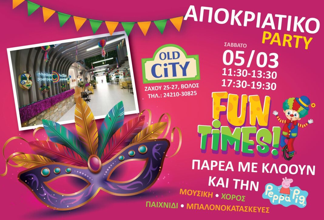 Συνεχίζονται τα πολύ πετυχημένα αποκριάτικα πάρτι στην στοά του OLD CITY – Αυτό το Σάββατο από τις 11:30 το πρωί και το απόγευμα από τις 17:30, η μουσική, ο χορός, τα παιχνίδια και οι μπαλονοκατασκευές πρωταγωνιστούν… Η ομάδα του OLD CITY περιμένει μικρούς και μεγάλους για να περάσουν αξέχαστα…