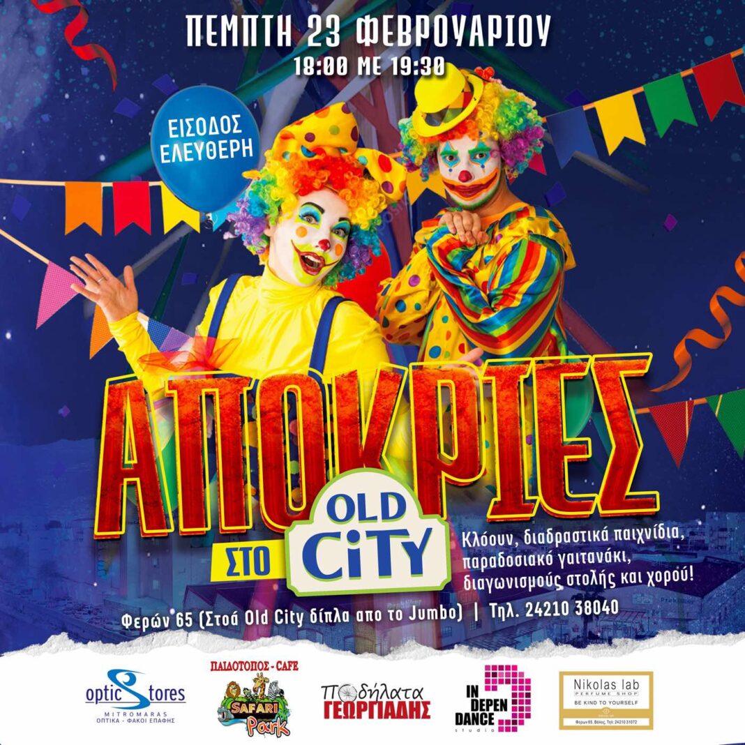 Αποκριάτικη εκδήλωση με κλόουν, διαδραστικά παιχνίδια, παραδοσιακό γαϊτανάκι, διαγωνισμούς στολής και χορού!