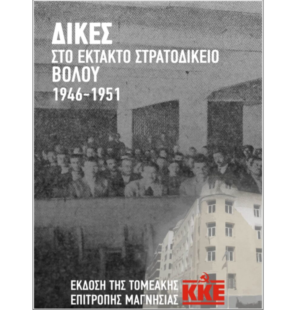 Η Τ.Ε. Μαγνησίας του ΚΚΕ θα πραγματοποιήσει εκδήλωση για την παρουσίαση της έκδοσης που επιμελήθηκε «ΔΙΚΕΣ ΣΤΟ ΕΚΤΑΚΤΟ ΣΤΡΑΤΟΔΙΚΕΙΟ ΒΟΛΟΥ 1946 – 1951».