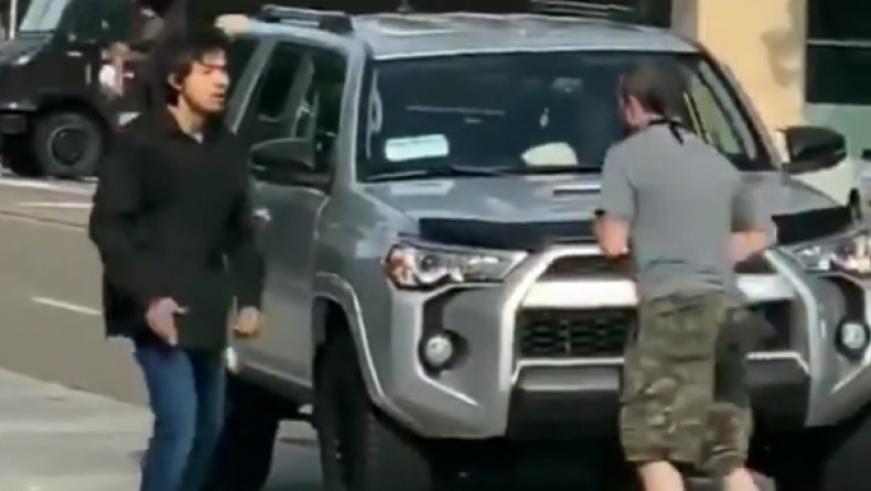 Ο τύπος με τη βερμούδα στρατιωτικής παραλλαγής απειλεί έναν τύπο ασιατικής καταγωγής και κινείται επιθετικά προς αυτόν. Ο Ασιάτης οπισθοχωρεί και βγαίνουν στη μέση του δρόμου, όπου σταματούν και δύο τζιπ και προσπαθεί να τον απωθήσει.