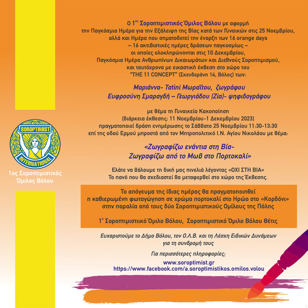 Με τον απαιτούμενο δυναμισμό και την αναμενόμενη συμμετοχή πραγματοποιούνται και φέτος από τον 1ο Σοροπτιμσιτικό Όμιλο Βόλου οι εκδηλώσεις ευαισθητοποίησης και ενημέρωσης για την Ημέρα Εξάλειψης της βίας κατά των Γυναικών το Σάββατο 25 Νοεμβρίου στην Ελλάδα και όλον τον κόσμο.Οι εκδηλώσεις, που ξεκίνησαν την Δευτέρα 20 Νοεμβρίου με την ανάγνωση κειμένων που αφορούν τη βία από Βολιώτες συγγραφείς και έκθεση έργων τέχνης από τις Μαριάννα; Μωραϊτου και Ευφροσύνη Σμαραγδή – Γεωργιάδου στο χώρο 11 στην οδό Σκενδεράνη, συνεχίστηκαν με την προβολή σχετικού ντοκυιμαντέρ στο Πολιτιστικό Κέντρο Ν.Ιωνίας από το Cine Doc και κορυφώνονται με τις δράσεις :Ανοικτή για το κοινό εκδήλωση σε ανοικτό χώρο το Σάββατο 25 Νοεμβρίου το πρωί έως τη 1.30 το μεσημέρι στον πεζόδρομο της Ερμού στην είσοδο του Ι.Ν. του Αγίου Νικολάου στο Βόλο θα πραγματοποιηθεί δράση με τίτλο «Ζωγραφίζω ενάντια στη Βία-Ζωγραφίζω από το Μωβ στο Πορτοκαλί» στην οποία οι πολίτες μπορούν να αφήσουν το δικό τους αποτύπωμα συνθέτοντας ένα πανό που αναρτηθεί στη συνέχεια στο χώρο 11 όπου θα παραμείνει έως το τέλος της έκθεσης την Παρασκευή 1η Δεκεμβρίου 2023.Οι εκδηλώσεις θα κορυφωθούν στις 6 το απόγευμα του Σαββάτου 25 Νοεμβρίου 2023 με τη φωταγώγηση του Ηρώον με πορτοκαλί χρώμα προβάλλοντας το μήνυμα για την εξάλειψη της βίας κατά των γυναικών. Η φωταγώγηση πραγματοποιείται από κοινού από τον 1ο Σοροπτιμιστικό Όμιλο Βόλου και τον Σοροπτιμιστικό Όμιλο Βόλου «Θέτις’.