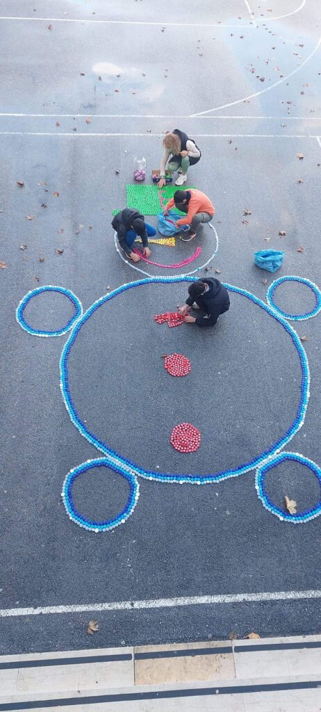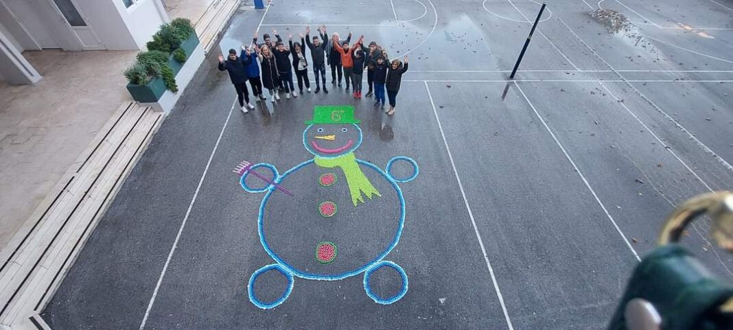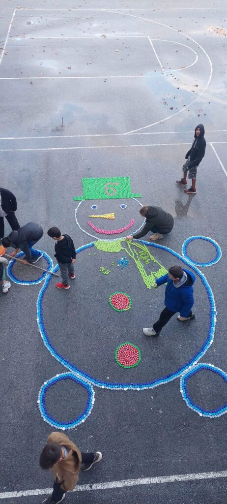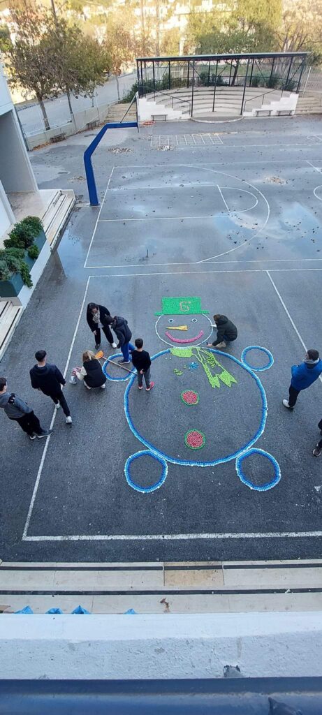 Σήμερα από τις 14.30 μέχρι 16.50 ,οι μαθητές του 6ου Γυμνασιου Βόλου με την παρουσία καθηγητών κ άλλων μελών της σχολικής κοινότητας και μόλις σταμάτησε η βροχή ξεκίνησαν την δημιουργία του χιονάθρωπου ύψους 6 μέτρων μετά από το πολύ επιτυχημένο Χριστουγεννιάτικο δεντράκι (ύψος 8.30 μέτρων κ 4.000 καπάκια). Ολα έγιναν με την παρουσία της τηλεόρασης του TRT με την Κωνσταντίνα Φωτοπούλου και τον Δονάτο κάμεραμαν στην εκπομπή του κου Πολύζου Σωτήρη. Βιωματικές ,διαθεματικές δημιουργίες που δημιουργούν ο μαθητές βελτιώνοντας τις δεξιότητες τους, μαθαίνοντας να είναι ευέλικτοι και να προσαρμόζονται σε διάφορες συνθήκες και να αποκτούν εμπειρίες για άλλα θέματα που τυχόν τους παρουσιαστούν στο μέλλον κ να προτείνουν λύσεις. Μαθαίνουν πόσο σημαντική είναι ανακύκλωση , πως μπορεί να επαχρησημοποιήσουν τα καπάκια που μαζεύουν, μειώνοντας συγχρόνως και το ενεργειακό τους αποτύπωμα .
