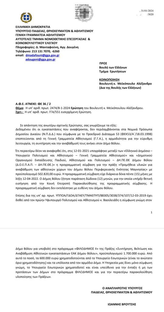 Ενδεικτική της αδιαφορίας της Δημοτικής Αρχής είναι και η από 31/01/2024 (Αρ.Πρωτ. ΓΓΑ/3020) Απάντηση της Γενικής Γραμματείας Αθλητισμού σε σχετική Ερώτησή μας. Σύμφωνα με το έγγραφο, η από 12/01/2021 Προγραμματική Σύμβαση που συνάφθηκε μεταξύ Υπουργείου Πολιτισμού & Αθλητισμού και Δήμου Βόλου για προμήθεια υλικών και αναβάθμιση αθλητικών χώρων του Δήμου κόστους 502.820 ευρώ, «δεν εκτελέστηκε με ευθύνη του Δήμου Βόλου».