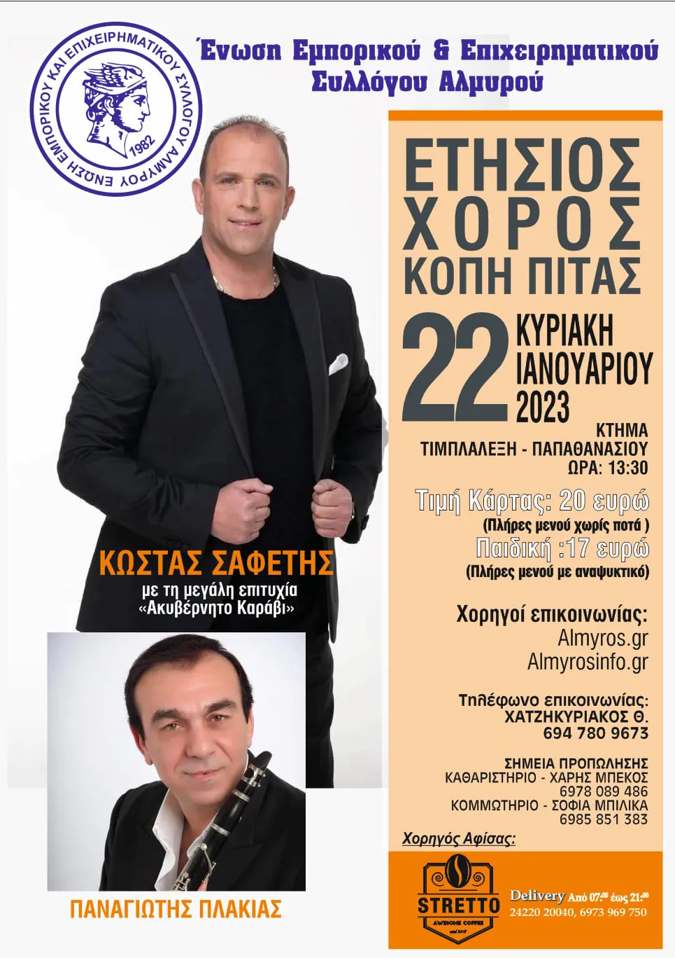 Η Ένωση Εμπορικού και Επιχειρηματικού Συλλόγου Επαρχίας Αλμυρού σας καλεί στην ετήσια χοροεσπερίδα -κοπή πίτας την Κυριακή 22 Ιανουαρίου 2023 και ώρα 13.30μ.μ. στο Κτήμα Παπαθανασίου – Τιμπλαλέξη στον Αλμυρό. Την εκδήλωση θα πλαισιώσουν οι Κ. Σαφέτης και Π. Πλακιάς με την ορχήστρα τους. Η τιμή της κάρτας ανέρχεται στα 20€ και περιλαμβάνει πλήρες μενού χωρίς ποτά, ενώ η παιδική κάρτα ανέρχεται στα 17€ με πλήρες μενού και αναψυκτικό. Στην εκδήλωση θα υπάρχει πλούσια λαχειοφόρος. Η προπώληση των καρτών πραγματοποιείται στα καταστήματα: «Καθαριστήριο Χάρης Μπέκος» (697 808 9486) και «Κομμωτήριο Σοφία Μπίλικα» (698 585 1383). Η παρουσία σας θα μας τιμήσει ιδιαίτερα.