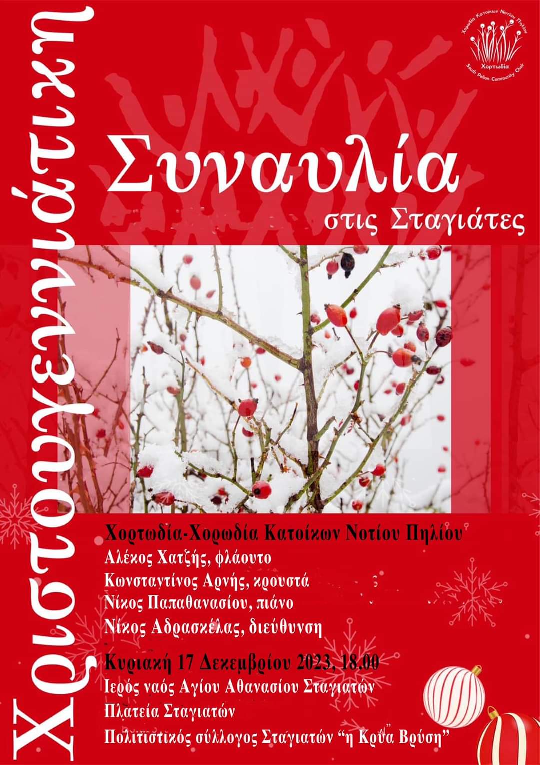 Με τον πολιτισμό και τις τέχνες ως το ουσιαστικότερο μέσο επαφής με τους κατοίκους της ευρύτερης περιοχής του Πηλίου, ο Σύλλογος Κρύα Βρύση, την Κυριακή 17 Δεκεμβρίου στις 18.00 το απόγευμα, φιλοξενεί την Χορτωδία – χορωδία κατοίκων του Νοτίου Πηλίου, για μία χριστουγεννιάτικη συναυλία. Την συναυλία θα πλαισιώσουν ο Αλέκος Χατζής στο φλάουτο, ο Κωνσταντίνος Αρνής στα κρουστά και ο Νίκος Παπαθανασίου στο πιάνο και θα διευθύνει ο Νίκος Αδρασκέλας.