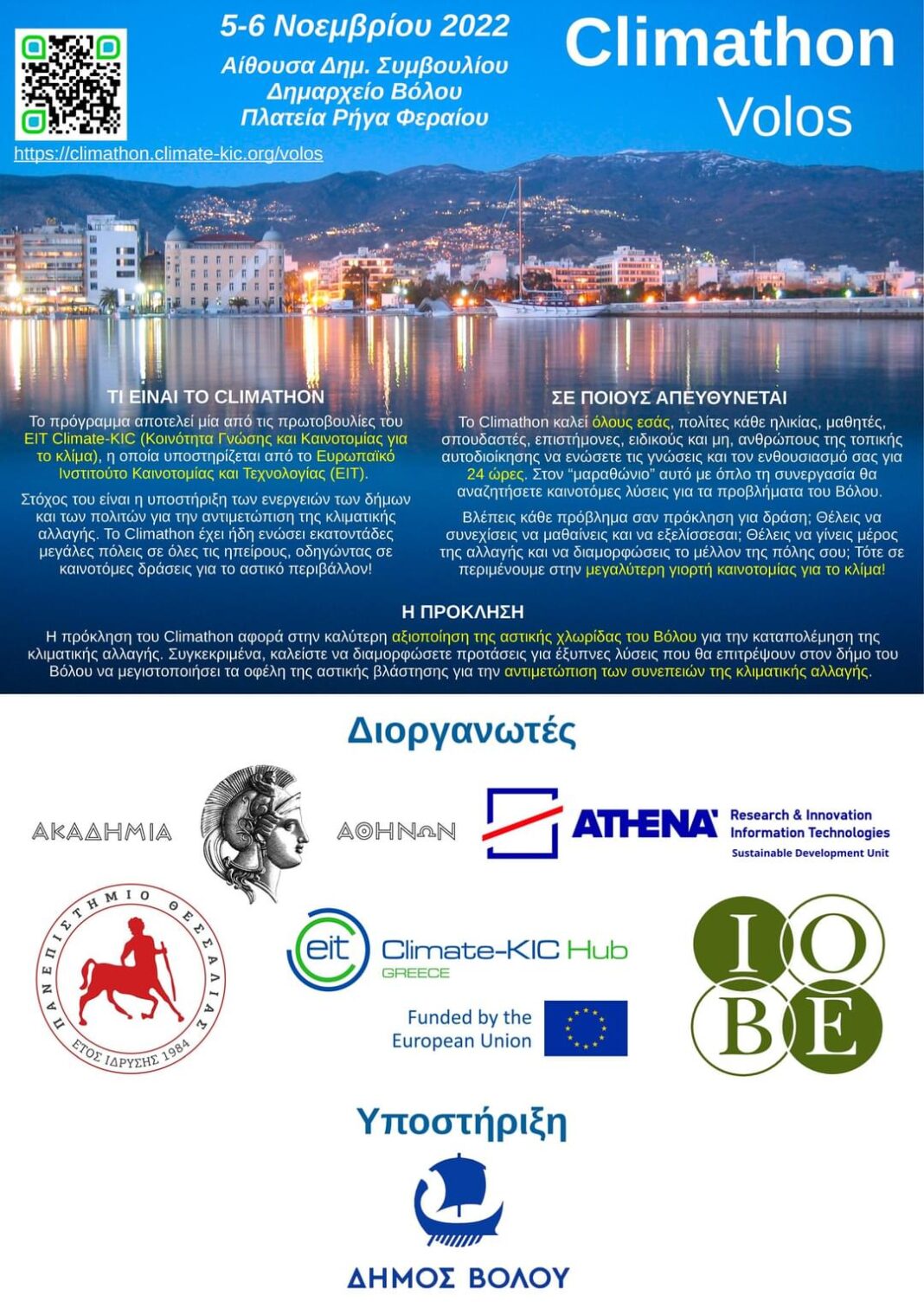 Το Κέντρον Ερεύνης Φυσικής της Ατμοσφαίρας και Κλιματολογίας της Ακαδημίας Αθηνών σε συνεργασία με το Εργαστήριο Γεωργικών Κατασκευών και Ελέγχου Περιβάλλοντος του Πανεπιστημίου Θεσσαλίας, το Ερευνητικό Κέντρο ΑΘΗΝΑ, το ΙΟΒΕ και με την υποστήριξη του Δήμου Βόλου, διοργανώνουν στο πλαίσιο το EIT Climate-KIC Greece Hub την εκδήλωση Climathon στον Βόλο, στις 5 και 6 Νοεμβρίου 2022, με θέμα: “Πρασινίζοντας την πόλη για την αντιμετώπιση της κλιματικής αλλαγής”