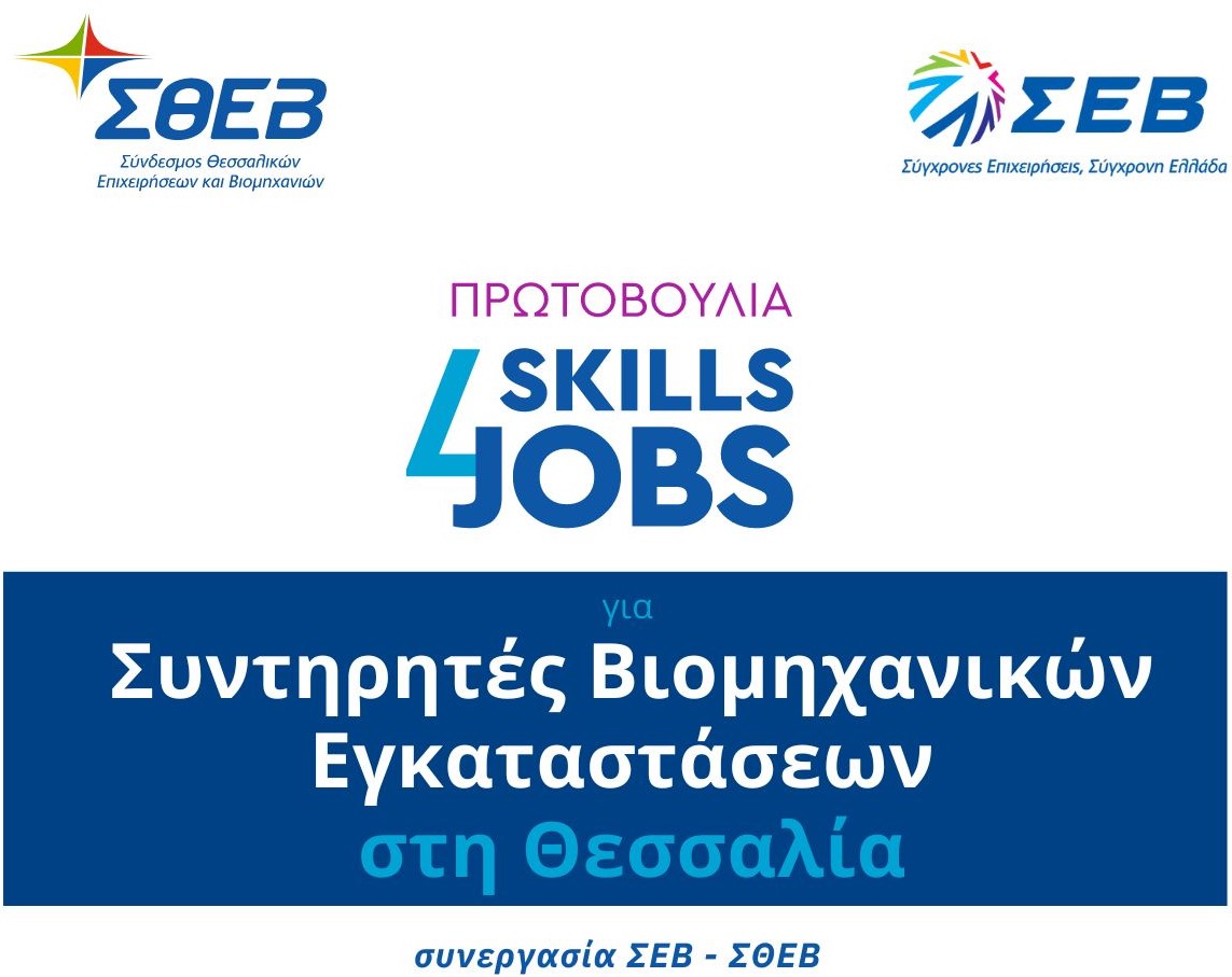 Το «Skills4Jobs για Συντηρητές Βιομηχανικών Εγκαταστάσεων στη Θεσσαλία» υλοποιείται από τον ΣΘΕΒ και τον ΣΕΒ με στόχο τη διασύνδεση και απασχόληση νέων αποφοίτων της τεχνικής και τεχνολογικής εκπαίδευσης με τις επιχειρήσεις της Θεσσαλίας. Η δράση απευθύνεται σε νέες και νέους που έχουν αποφοιτήσει από την επαγγελματική εκπαίδευση και κατάρτιση σε συναφείς ειδικότητες, χωρίς προηγούμενη ή με μικρή προϋπηρεσία και προσφέρεται χωρίς οικονομική επιβάρυνση.