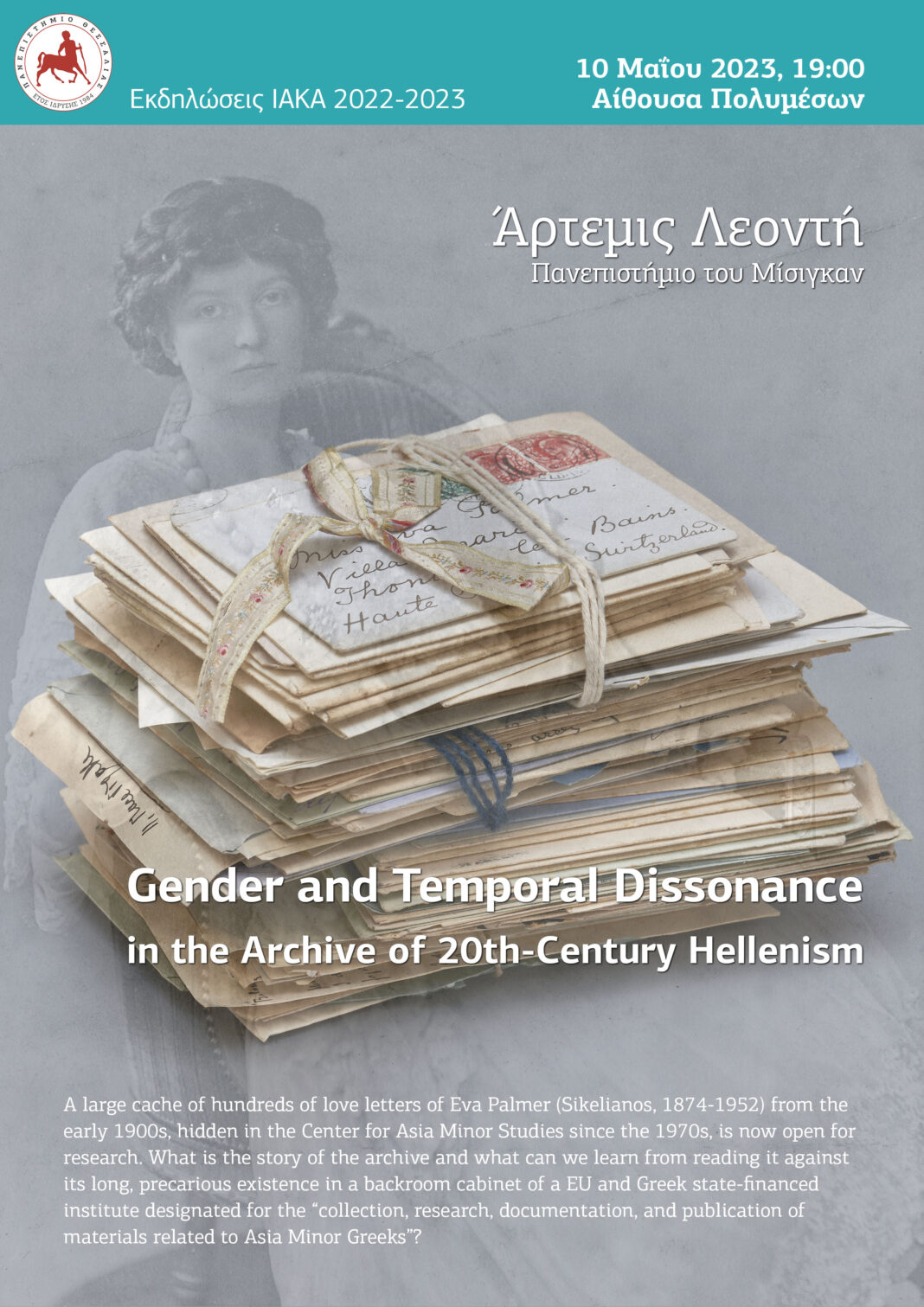 Αυτή η ομιλία ακολουθεί τις ανατροπές και τις στροφές της δημιουργίας του αρχείου της Εύας Πάλμερ, συμπεριλαμβανομένης της τρέχουσας κατάστασής του, και διαβάζει χειρόγραφα και αντικείμενα της συλλογής εστιάζοντας στις έμφυλες, συναισθηματικές, κοινωνικά αποκλίνουσες επιθυμίες που εκφράζουν και στις εναλλακτικές ιστορίες και την κοινωνία που φιλοδοξούν να δημιουργήσουν. Η έμφυλη και χρονική ασυμφωνία —και οι τυχαίοι συντονισμοί— της ύπαρξης αυτού του αρχείου, σε ένα ινστιτούτο αφιερωμένο στη μελέτη των Ορθοδόξων Χριστιανών στη Μικρά Ασία και τον ξεριζωμό τους στην Ελλάδα πριν από 100 χρόνια, στην πρώτη υποχρεωτική ανταλλαγή πληθυσμών του 20ου αιώνα, παρέχει ένα αναπόφευκτο πλαίσιο διερώτησης σχετικά με το εύρος του αρχείου του ελληνισμού του 20ού αιώνα και τους πόρους που κρύβει για την ενασχόληση με τη συγκρότηση του κοινωνικού σώματος στην επισφαλή παρούσα στιγμή.