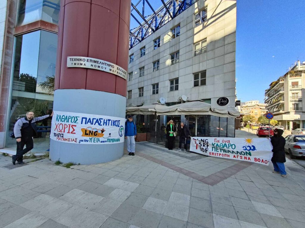 Στην είσοδο του ΤΕΕ Μαγνησίας βρέθηκαν σήμερα το απόγευμα μέλη των οικολογικών οργανώσεων του Βόλου, της Περιβαλλοντικής Πρωτοβουλίας, των Πολιτών για την Υγεία και το Περιβάλλον, της Επιτροπής πολιτών κατά της καύσης από την ΑΓΕΤ και διαμαρτυρήθηκαν με αφορμή εκδήλωση της ΑΓΕΤ, όπου παρουσιάζονταν ένα νέο τεχνολογικά πρόγραμμα για τη δέσμευση του διοξειδίου του άνθρακα.