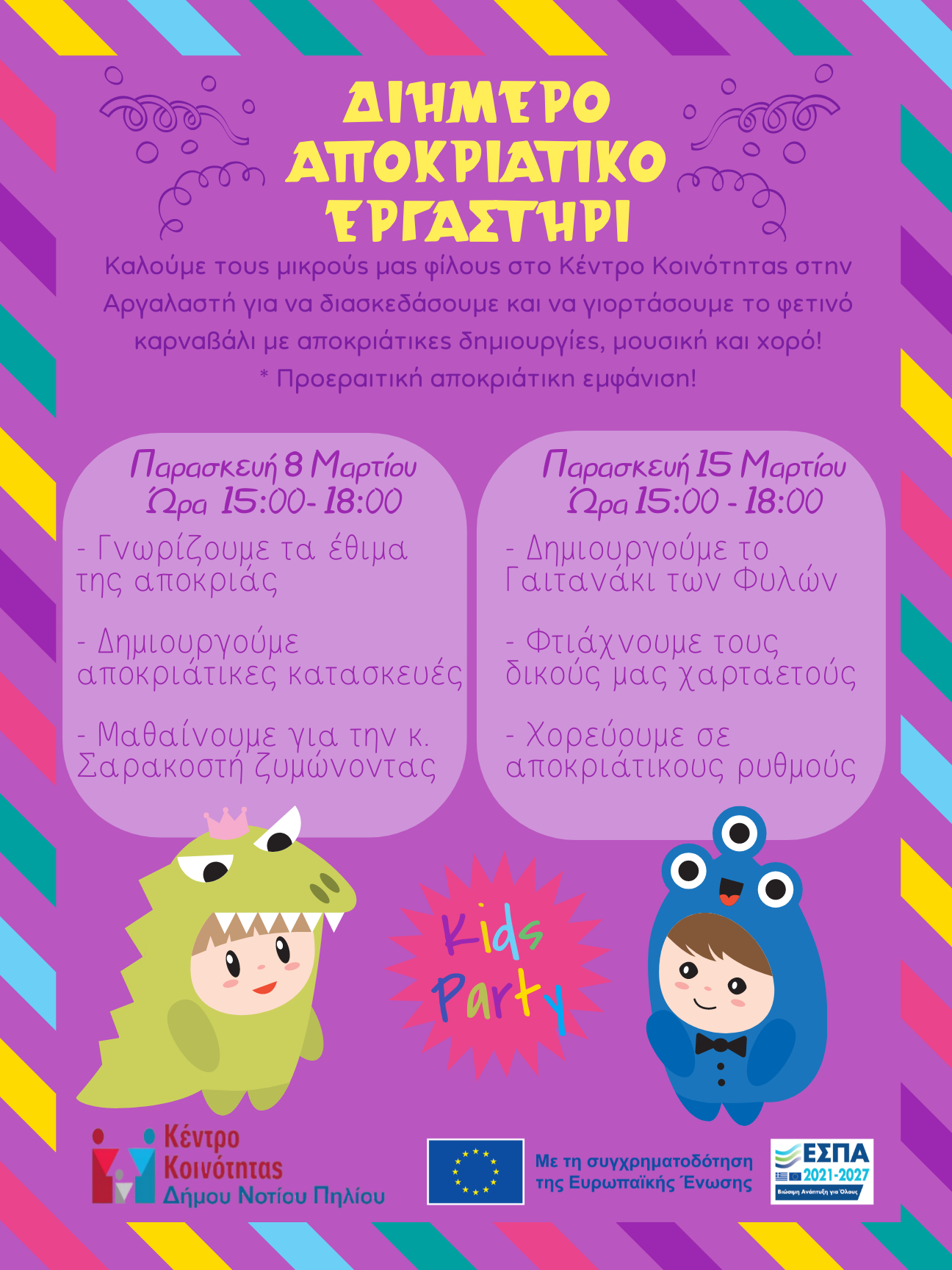 Το Κέντρο Κοινότητας Δήμου Νοτίου Πηλίου προσκαλεί όλα τα παιδιά του Δήμου, να συμμετάσχουν στο Διήμερο Αποκριάτικο Εργαστήρι προκειμένου να διασκεδάσουν, να δημιουργήσουν, να χορέψουν και να γνωρίσουν τα έθιμα της αποκριάς και την προέλευσή τους.