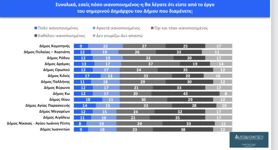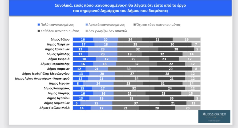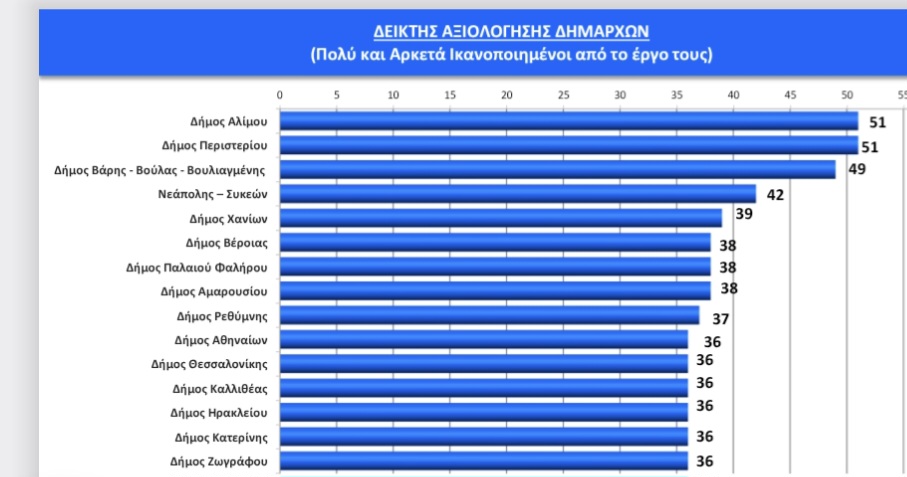 Την πρώτη θέση μοιράζονται οι δήμαρχοι Αλίμου Α. Κονδύλης και Περιστερίου Α. Παχατουρίδης με 51% («πολύ» και «αρκετά ικανοποιημένος»), ενώ την πρώτη τριάδα συμπληρώνει ο Γρ. Κωνσταντέλλος (3Β) με 49%. Στην τέταρτη θέση συναντάμε τον Σ. Δανιηλίδη (Νεάπολης – Συκεών) με 42%, στην πέμπτη τον Π. Σημανδηράκη των Χανίων με 39%, ενώ τρεις δήμαρχοι βρίσκονται στην έκτη θέση (Κ. Βοργιαζίδης-Βέροιας, Γ. Φωστηρόπουλος-Παλαιού Φαλήρου και Θ. Αμπατζόγλου-Αμαρουσίου) με 38%. Την ένατη θέση καταλαμβάνει ο δήμαρχος Ρεθύμνου Γ. Μαρινάκης με 37%, ενώ την δέκατη θέση με 36% μοιράζονται εφτά δήμαρχοι (Αθηναίων: Χ. Δούκας, Θεσσαλονίκης: Στ. Αγγελούδης, Καλλιθέας: Κ. Ασκούνης, Ηρακλείου: Α. Καλοκαιρινός, Κατερίνης: Γ. Ντούμος, Ζωγράφου: Τ. Καφατσάκη και Βολου: Α. Μπέος).