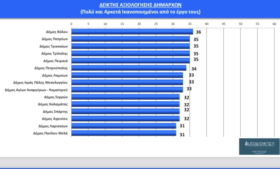 Μετά τους περιφερειάρχες, με την αξιολόγηση των δημάρχων κλείνει η εξαμηνιαία πανελλαδική δημοσκόπηση του aftodioikisi.gr αναφορικά με την εικόνα της Αυτοδιοίκησης στους πολίτες, που διεξήχθη από 5 έως 19 Ιανουαρίου σε δείγμα 6.005 ατόμων. Από τους 60  δημάρχους που αξιολογήθηκαν στην έρευνα οι 19 βρίσκονται κάτω από την (χαμηλή) «βάση» του 29% (σ.σ. μέσος όρος ικανοποίησης των πολιτών από τους δημάρχους), εφτά ακριβώς στο όριο και 34 πάνω από αυτό.