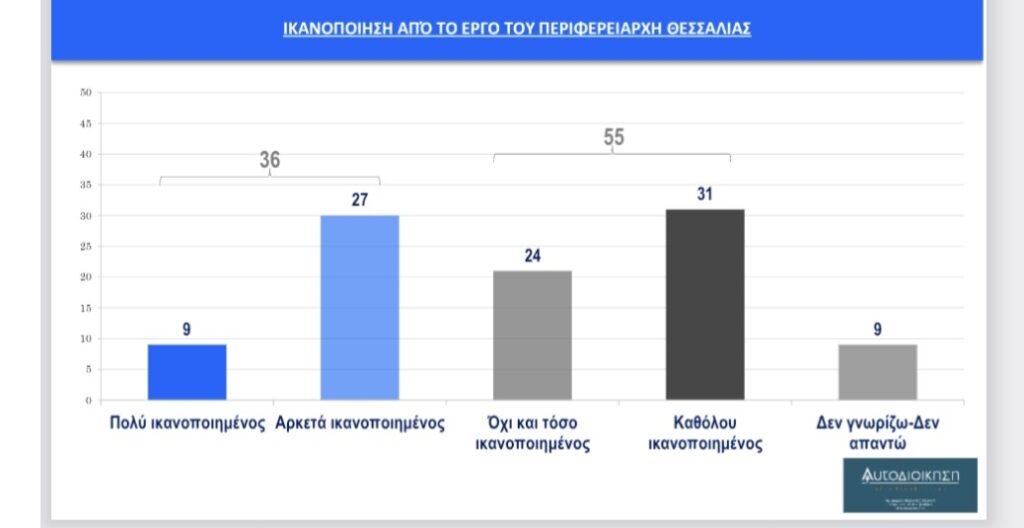 -Στην τελευταία θέση με μόλις 21% (8% «πολύ» και 13% «αρκετά ικανοποιημένοι») βρίσκεται η περιφερειάρχης Κεντρικής Μακεδονίας, διάδοχος του Απ. Τζιτζικώστα, Α. Αηδονά.
