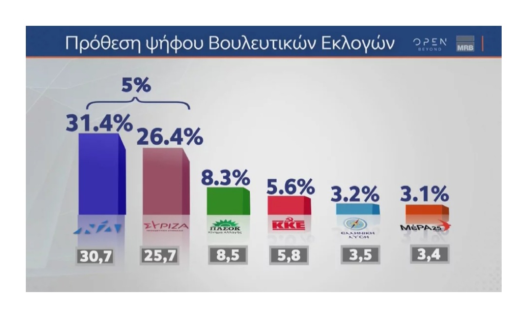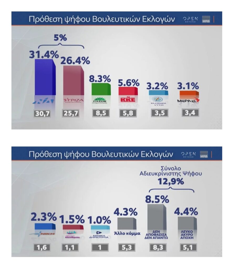 Στο 5% διαμορφώνεται η διαφορά μεταξύ ΝΔ και ΣΥΡΙΖΑ σύμφωνα με την τελευταία δημοσοποιήσιμη πριν τις εκλογές δημοσκόπηση της MRB για λογαριασμό του Open.