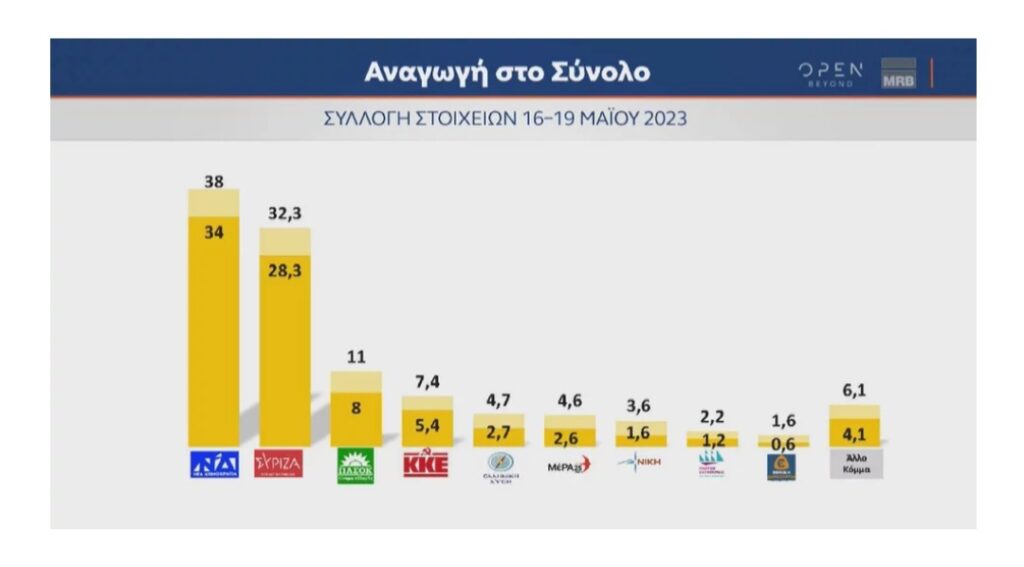 Όσον αφορά την πρόθεση ψήφου με αναγωγή στο σύνολο, η Νέα Δημοκρατία μπορεί να φτάσει μέχρι και στο 38%, ο ΣΥΡΙΖΑ μέχρι 32,3%, το ΠΑΣΟΚ-ΚΙΝΑΛ μέχρι 11%, το ΚΚΕ μέχρι 7,4%, η Ελληνική Λύση μέχρι το 4,7%, το ΜέΡΑ25 μέχρι 4,6%, ενώ υπάρχει και η έκπληξη της Νίκης, που «φλερτάρει» να μπει στη Βουλή με μέγιστο ποσοστό έως και 3,6%.
