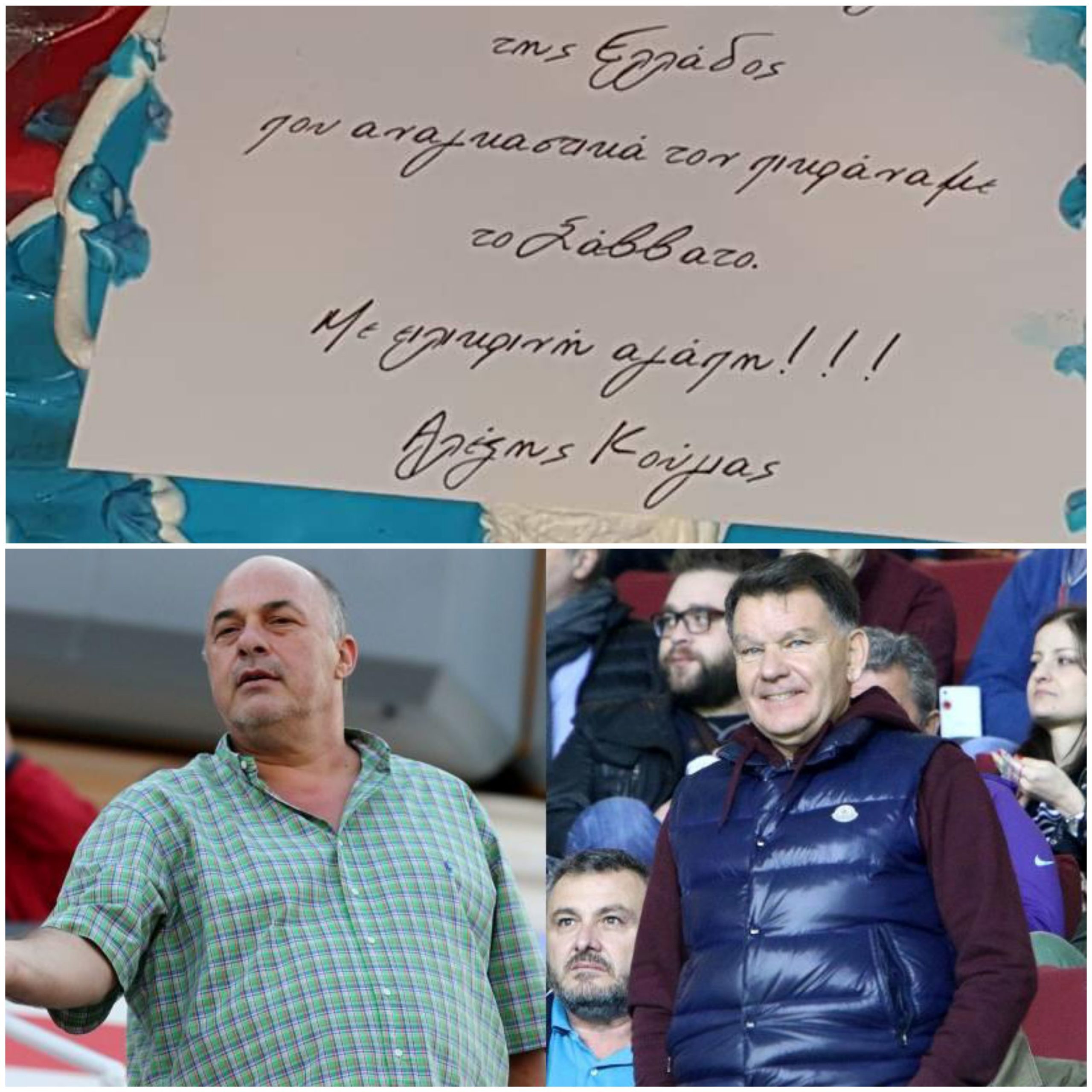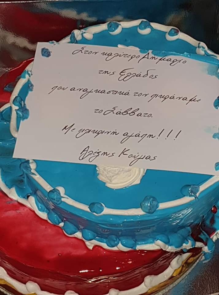 Διώροφη τούρτα, λοιπόν, σε μπλε και κόκκινο μου έστειλε ο Αλέξης ο Κούγιας με την αφιέρωση «στον καλύτερο Δήμαρχο της Ελλάδας, που αναγκαστικά τον πικράναμε το Σάββατο. Με ειλικρινή αγάπη!!! Αλέξης Κούγιας»