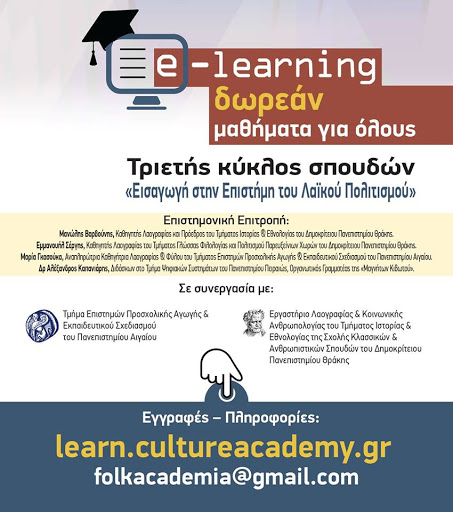 Πρόκειται για τα μαθήματα Ψηφιακή Λαογραφία (α κύκλος), Θρησκευτική Λαογραφία(β κύκλος). Τα μαθήματα υλοποιούνται με την συνεργασία του Τμήματος Ιστορίας & Εθνολογίας της Σχολής Κλασσικών & Ανθρωπιστικών Σπουδών του Δημοκρίτειου Πανεπιστήμιο Θράκης, καθώς και του Τμήματος Επιστημών Προσχολικής Αγωγής & Εκπαιδευτικού Σχεδιασμού του Πανεπιστημίου Αιγαίου.