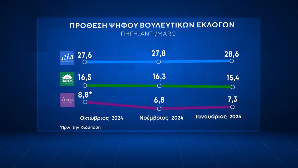 Δημοσκόπηση Marc: Ανεβαίνει η ΝΔ, χάνει έδαφος το ΠΑΣΟΚ, τρίτος ο ΣΥΡΙΖΑ