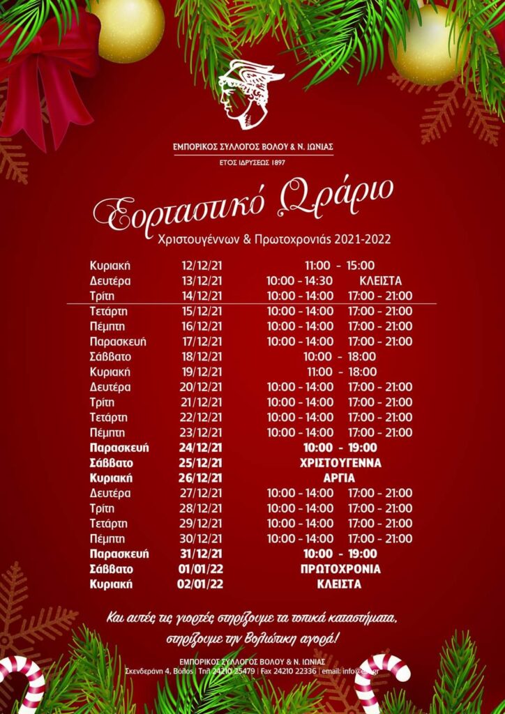 Σύμφωνα με την τελευταία Δ1α/Γ.Π.οικ. 75414/3.12.2021 , η οποία ορίζει το ωράριο έναρξης λειτουργίας στις 10.00, προτείνεται στα εμπορικά καταστήματα – μέλη του Εμπορικού Συλλόγου Βόλου όπως ακολουθήσουν το προτεινόμενο εορταστικό ωράριο λειτουργίας Χριστουγέννων 2021 & Πρωτοχρονιάς 2022 με έναρξη Τετάρτη 15/12/2021, όπως έχει αποφασισθεί από όλους τους Εμπορικούς Συλλόγους της Θεσσαλίας.