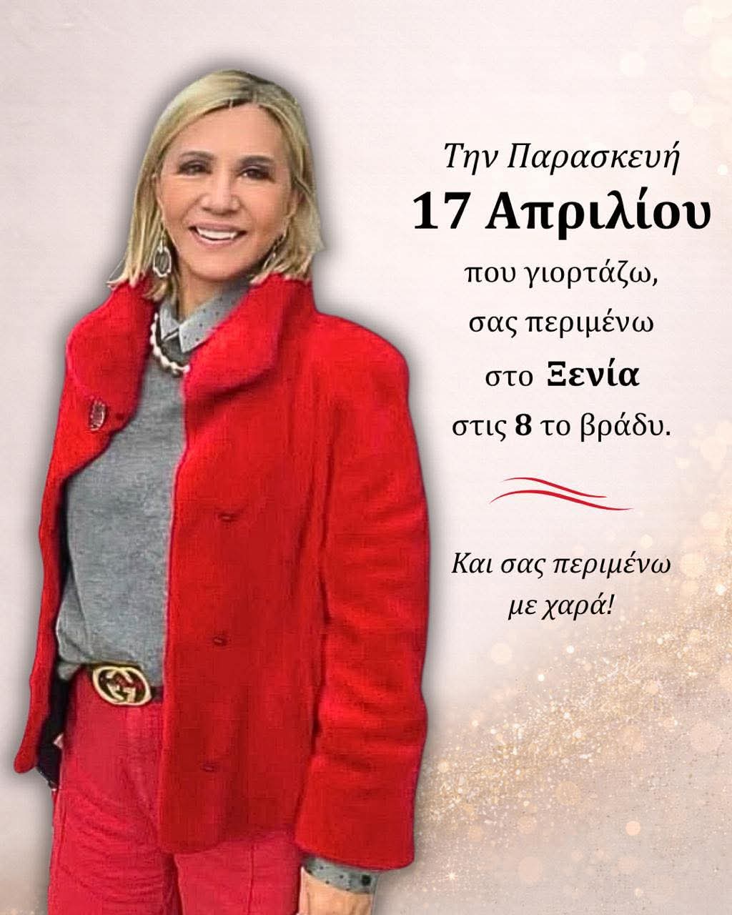Οπως σημειώνει στην πρόσκληση της, την Παρασκευή, 17 Απριλίου που γιορτάζω, σας περιμένω, στο Ξενία, στις 8 το βράδυ.Και σας περιμένω με χαρά!