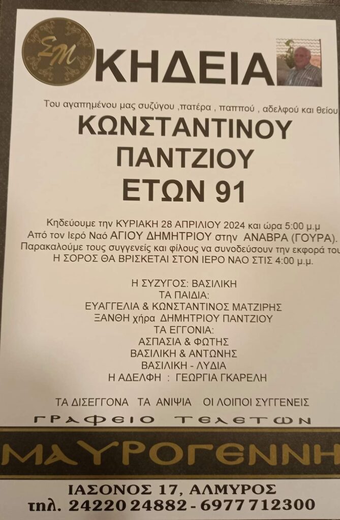 Η καμπάνα στη Γούρα, την Ανάβρα του Αλμυρού σήμερα πριν το ηλιοβασίλεμα, σήμανε το ταξίδι του κυρ-Κώστα Πάντζιου στην αιωνιότητα.