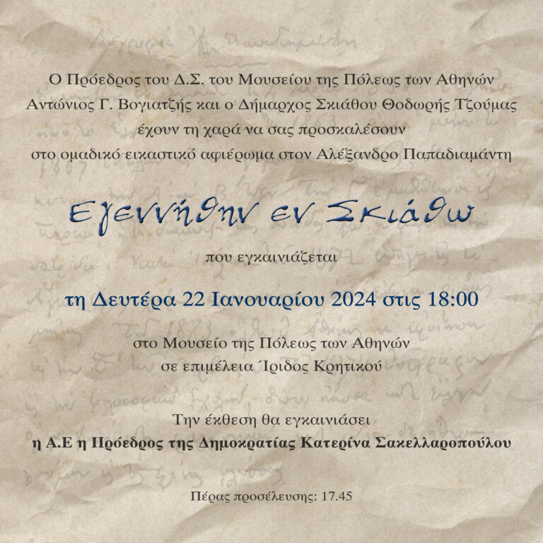 Εγκαινιάζεται την Δευτέρα 22 Ιανουαρίου 2024, στις 18:00 στο Μουσείο της Πόλεως των Αθηνών από την Α.Ε. την Πρόεδρο της Δημοκρατίας Κατερίνα Σακελλαροπούλου η ομαδική εικαστική έκθεση – αφιέρωμα «Εγεννήθην εν Σκιάθω». Πρόκειται για ένα σπονδυλωτό ψυχογραφικό και τοπιογραφικό εικαστικό αφήγημα για τον κορυφαίο των ελληνικών γραμμάτων, Αλέξανδρο Παπαδιαμάντη σε συνδιοργάνωση του Δήμου Σκιάθου, και του Μουσείου της Πόλεως των Αθηνών, επιμέλειας της ιστορικού τέχνης, Ίριδας Κρητικού και με τη συμμετοχή εβδομήντα πέντε διακεκριμένων εικαστικών από τη Σκιάθο και την υπόλοιπη Ελλάδα.