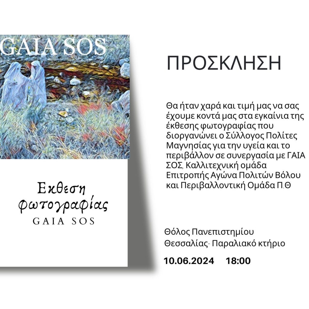 Ο Σύλλογος “Πολίτες Μαγνησίας για την υγεία και το περιβάλλον” μαζί με την ομάδα ΓΑΙΑ ΣΟΣ, την καλλιτεχνική ομάδα της Επιτροπής Αγώνα Πολιτών Βόλου κατά της καύσης σκουπιδιών και την Περιβαλλοντική ομάδα του ΠΘ διοργανώνουν μια έκθεση φωτογραφίας με τίτλο “GAIA SOS: οι σιωπηλές κραυγές της πόλης”.